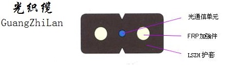 FTTH室內光纜是將光通信單元處于中心,兩側放置兩根平行非金屬加強元件(FRP),在外側再附加一根鋼絲加強元件,最后,擠制黑色或彩色低煙無鹵護套成纜