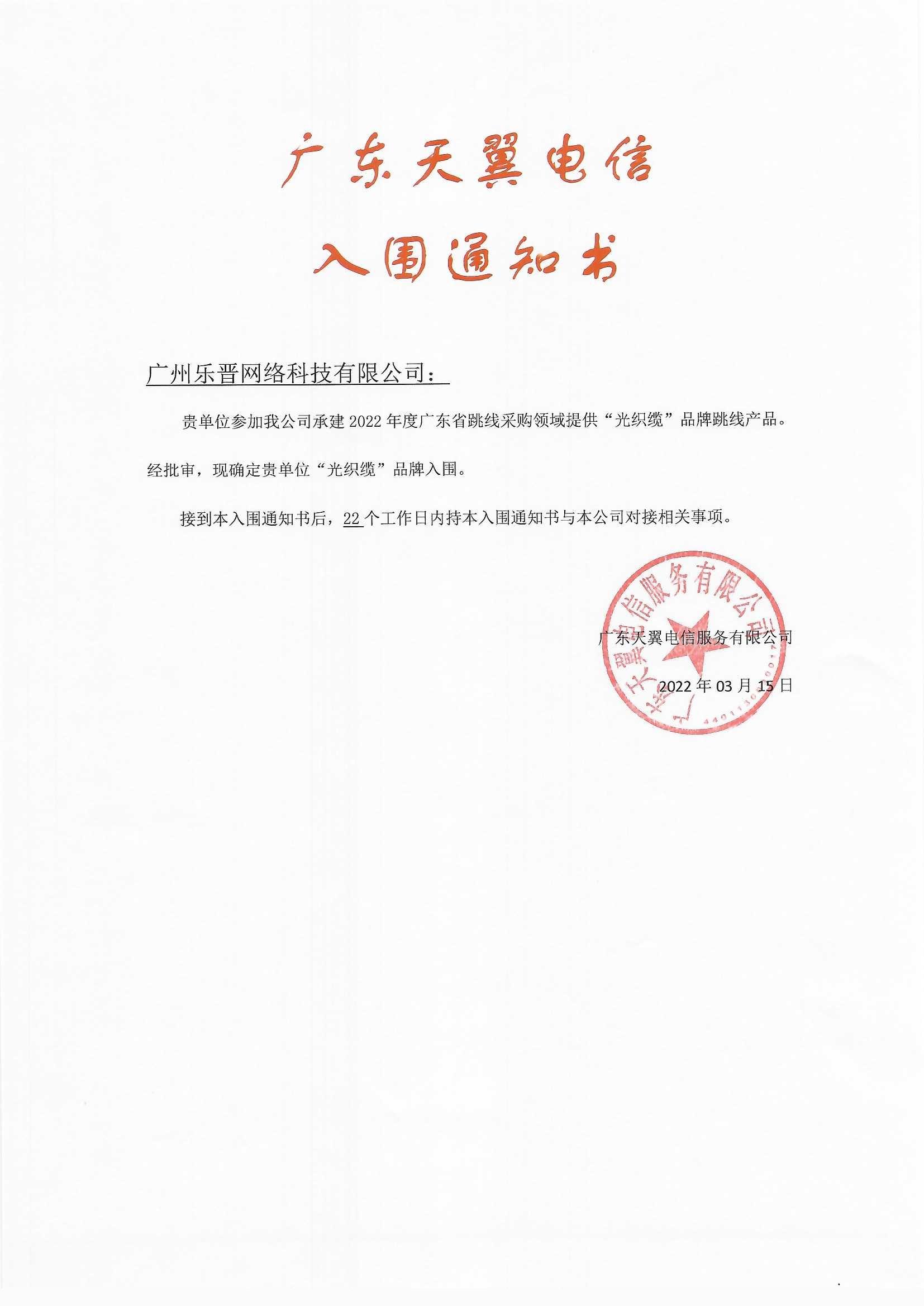 廣東天翼電信服務有限公司廣東省采購光纖跳線入圍通知書再次入圍