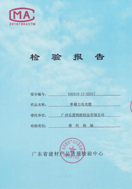 廣東省建材產品質量檢驗中心出具光織纜GYXTW12芯及以下單模萬兆光纜檢驗報告。